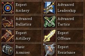 Leadership Aumenta a moral dos exércitos e facilita combinações. Com a moral elevada suas unidades podem repetir o turno, atacando novamente. Ainda como moral elevado, você terá diminuido o efeito negativo quando por acaso tiver no seu exércitos criaturas de diferentes castelos.